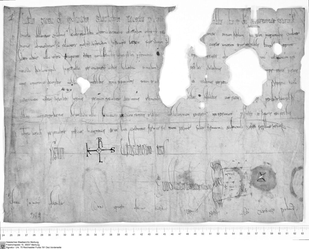 Zunächst herrschte seit dem 18. Jahrhundert bis ins frühe 20. Jahrhundert die Ansicht vor, beim Rosdorf dieser Urkunde handele es sich um das Fuldaer Filialkloster Rastorf bzw. Ratestorf. Erst als einem aufmerksamen Bearbeiter der Urkunden, Herrn Stengel, im 20. Jahrhundert auffiel, dass eine andere Urkunde , ein Jahr jünger, also von 780, bewies, das besagtes Rastorf, das man bis dahin für das Rostorf unserer Urkunde von 781 gehalten hatte, nicht vom König, sondern von mehreren Grafen an Fulda geschenkt worden war. Dass zwei dieser Grafen einen verwandtschaftlichen Bezug zum Besitzer Rosdorfs und zu den später dort amtierenden Grafen aufweisen, wurde bisher nur teilweise von R. Wenskus erkannt, jedoch nie wissenschaftlich nachvollzogen und per schlüssiger Theorie der Allgemeinheit zugänglich gemacht. Besagter Herr Stengel, ein eigentlich sehr honoriger, beflissener Geschichtswissenschaftler, befand sich, nachdem er den jahrhundertealten Fehler der falschen Zuordnung nachgewiesen hatte, in einer Zwickmühle. Urplötzlich musste er seinen kritisch lauernden Fachkollegen eine plausible, neue Theorie verkaufen. Bei seinem Bemühen unterlief Stengel ein weitverbreiteter Fehler unter hoch engagierten Wissenschaftlern: obwohl sie sich eine wunderschöne, insgesamt plausible Theorie ausdenken und im Fall der Geschichtswissenschaft mittels ihnen vorliegender Urkunden beweisen können und wollen, hakt es an einer oder zwei, drei winzigen Stellen. Um den investierten Arbeits- und Zeitaufwand nicht umsonst investiert zu haben, wird bei solchen Gelegenheiten gern mal etwas „gerade“ gemacht, das etwas eckig im Weg steht. So auch bei Stengels neuer, bis auf den heutigen Tag vielfach gültig anerkannter Theorie. Wäre da nicht in obiger Urkunde ein vermaledeiter Schönheitsfehler. Wie von jedem Laien zu erkennen, wurde, was im Mittelalter eine gern angewandte und verbreitete Methode war, mittels „Rasur“ (mit Hilfe einer scharfen Klinge) das an Buchstaben und Worten einer älteren Urkunde ausradiert, das störte, um den Inhalt im eigenen Interesse umzuformulieren, sprich zu fälschen. Mittelalterliche Mönche und Geistliche waren nicht nur begnadete Ersteller von Originalurkunden, sondern eben auch in der Zweit- und Drittverwertung der Urkunden – selbst der Papst ging da mit bestem Beispiel voran, indem er die Urkunde fälschen ließ, mit der er beweisen wollte, ihm habe schon immer ein großes Gebiet in Italien gehört. So kam der Papst, dank heute erkennbarer Fälschung zu seinem Kirchenstaat. – sprich gekonnte Fälscher, um Urkunden so abzuändern, dass sie zu den Begünstigten wurden etc. Bei der Urkunde von 781 wurde ebenfalls nachträglich Hand angelegt: man radierte, ehrlich gesagt handwerklich sehr schlecht, den Buchstaben r aus dem Namen von Hardrad, um das fehlende r durch ein schwungvolles l zu ersetzen. Auch die Übermalung gelang dem ungeschickten Fälscher nicht wirklich. Da er dunklere Tinte verwendete und das l zudem etwas ungelenk über das nur schlecht wegrasierte r malte, fällt dies plumpe Fälschung nun wirklich Jedem auf, der das Original betrachtet. Nun hatte Stengel den Vorteil auf seiner Seite, dass zu seiner Zeit eine originalgetreue Abbildung des Urkundenoriginals noch nicht existierte. Also konnte er munter drauflos schreiben und, obwohl er die kleine Fälschung nicht verschwieg, baute er um sie herum seine nicht minder heftige eigene Fälschung auf. Stengel behauptet in seinen Ausführungen, der Schreiber der Urkunde habe beim Schreiben einen Fehler gemacht, nämlich statt des l ein r geschrieben. Als er seinen Schreibfehler bemerkte, habe er versucht, mittels Rasur und dem Einflicken des l den Schaden zu beheben. Dumm nur, dass Edmund Ernst Stengel, ein überzeugter Nazi, in seinem Übereifer, die Dinge passend machen zu wollen, denn seine zweifelhafte Theorie basiert auf dem Namen Haldrad(us), sehr großzügig und nonchalant sich mal den anders geschriebenen Namen des einen Schenkers radebrechend zu Haldradus hinbog, das andere Mal so tat, als sei Haldrat mit Hardrat gleichzusetzen, sprich, Urkunden, die unzweideutig von Hardrat stammen, unter Haldrat vereinnamte. Heraus kam die inzwischen als falsch erwiesene Behauptung, mit dem Rostorf aus der Urkunde von 781 sei Roßdorf gemeint. Als braver hessischer Patriot kam es Stengel nicht in den Sinn, das Rosdorf der Urkunde außerhalb Hesssens zu verorten. Nachdem also Rasdorf ausfiel, musste ein Ersatz her. Da die beiden anderen Rosdörfer Hessens aus urkundlich klaren Ursachen ausfielen, entschied sich Regionalpatriot Stengel für Roßdorf.